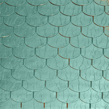 Патинированная черепица, выполненная из искусственно состаренной меди превосходно ложится на кровлю, не требует ни ремонта, ни сложного ухода. |